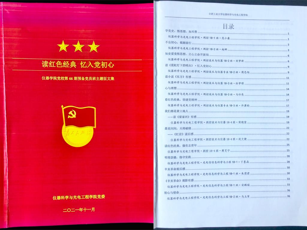 为充分挖掘党史学习教育题材,从当代青年视角诠释中国共产党为人民谋幸福、为民族谋复兴的初心使命,仪器学院分党校第66期预备党员班、发展对象班共同举办了“读红色经典·忆入党初心”征文比赛。